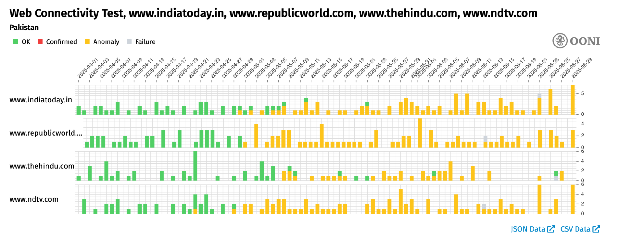 Chart: OONI Probe testing of www.indiatoday.in, www.republicworld.com, www.thehindu.com, and www.ndtv.com in Pakistan between 1st April 2025 to 29th May 2025 (source: OONI data).